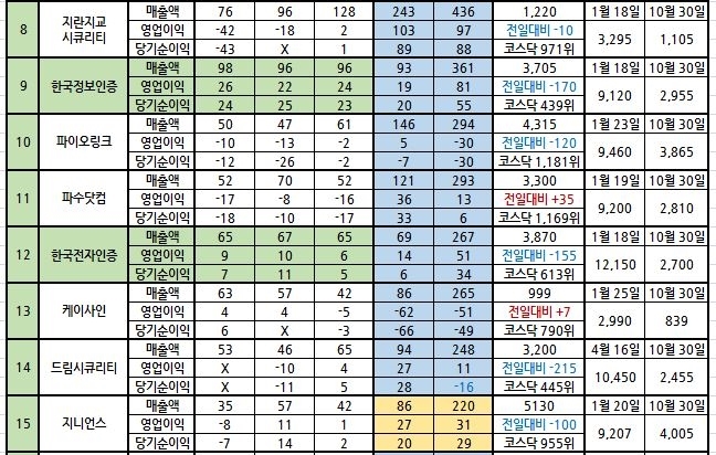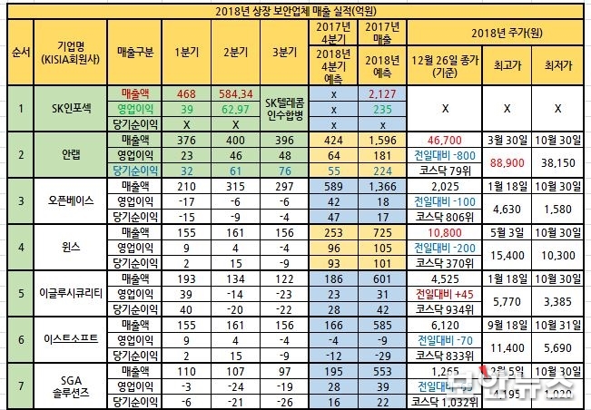 위의 표는 코스닥에 상장된 국내 정보보안 업체들의 순위를 나타낸 것입니다