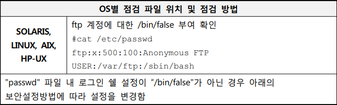 - 취약 : ftp 계정에 /bin/false 쉘이 부여되어 있지 않은 경우