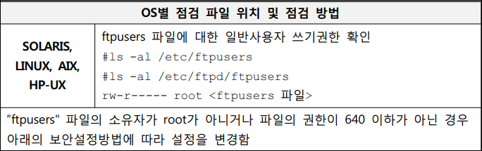 - 비인가자들의 ftp 접속을 차단하기 위해 ftpusers 파일 소유자 및 권한을 관 리해야함