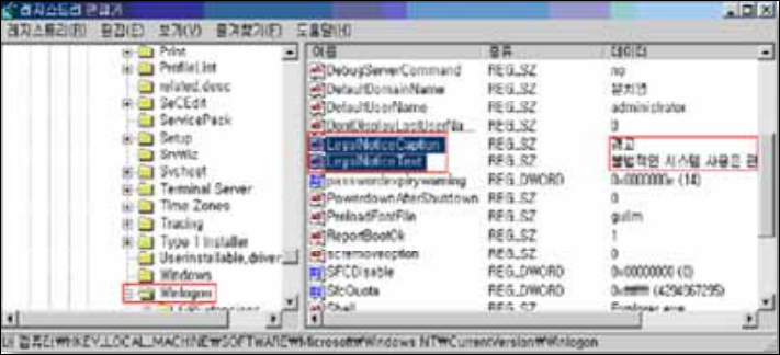 - 로그온 시 경고 메시지를 설정하여 시스템에 로그온을 시도하는 사용자들에 게 관리자는 시스템의 불법적인 사용에 대하여 경고 창을 띄움으로써 경각 심을 주기 위함
