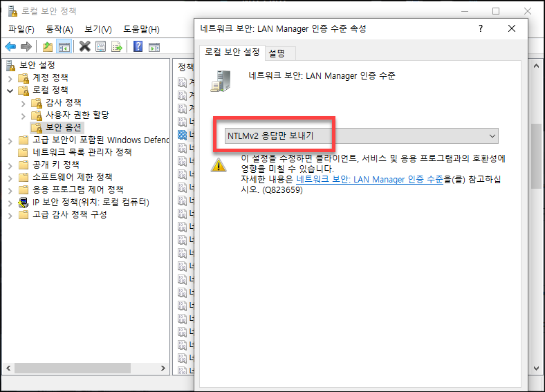 : 네트워크 보안: LAN Manager 인증 수준 -> NTMLv2 응답만 보내기