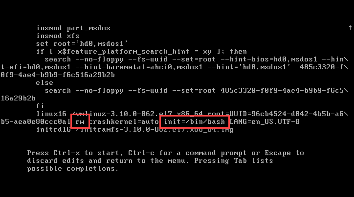 rhgb quiet -> init=/bin/bash