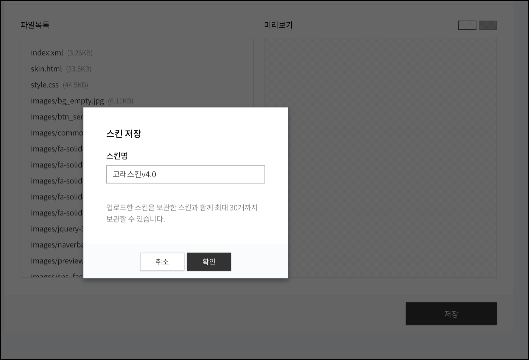 스킨명을 입력하시고 스킨 저장을 해주세요