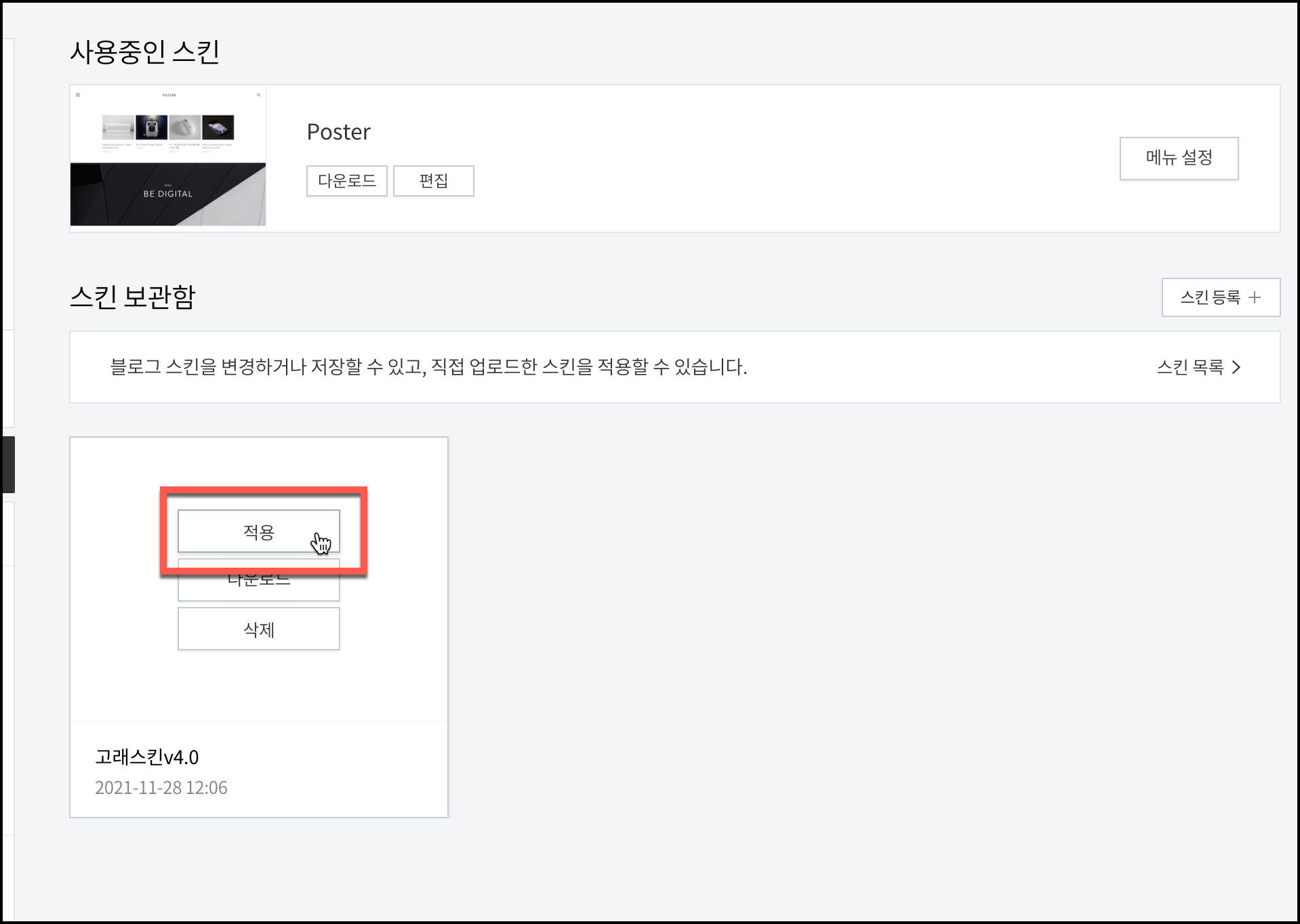 아까 저장한 스킨 "적용"을 클릭해 줍니다.