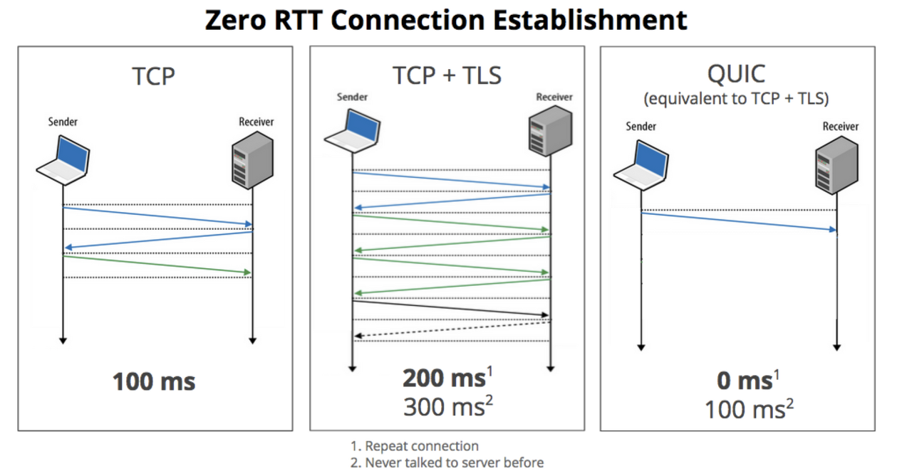 스트리밍 서비스, 게임 등에서 지연시간을 줄이기 위해 사용합니다. 전송 왕복 시간 RTT(Round-Trip Time)가 0에 수렴합니다.