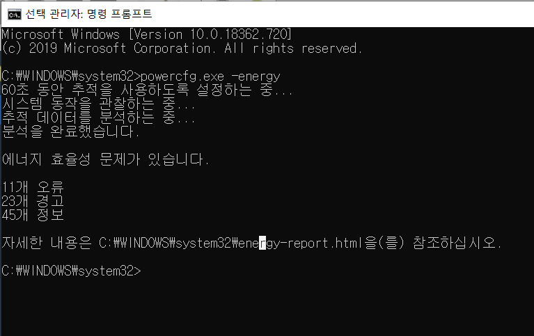 명령 프롬프트 창에 "powercfg.exe -energy"라고 입력하시고 enter를 눌러줍니다