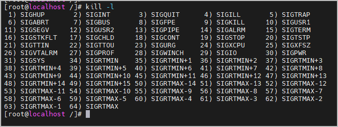 53) SIGRTMAX-11 54) SIGRTMAX-10 55) SIGRTMAX-9 56) SIGRTMAX-8 57) SIGRTMAX-7