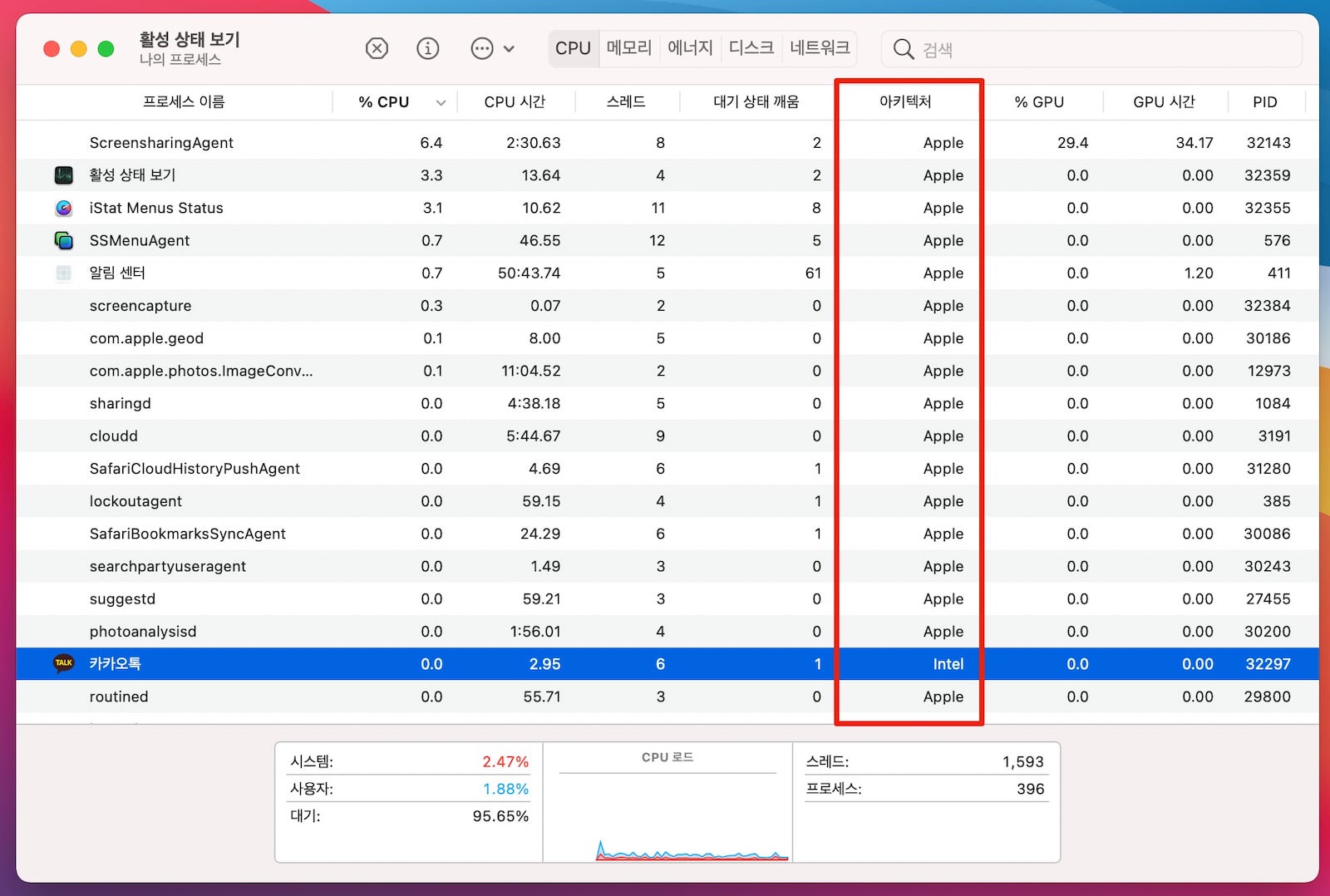 활성 상태 보기에서는 아키텍처 부분에서 Apple이라고 나와 있는 유니버설 앱과 Intel이라고 나와 있는 인텔 기반의 프로그램을 각각 확인하실 수 있습니다.