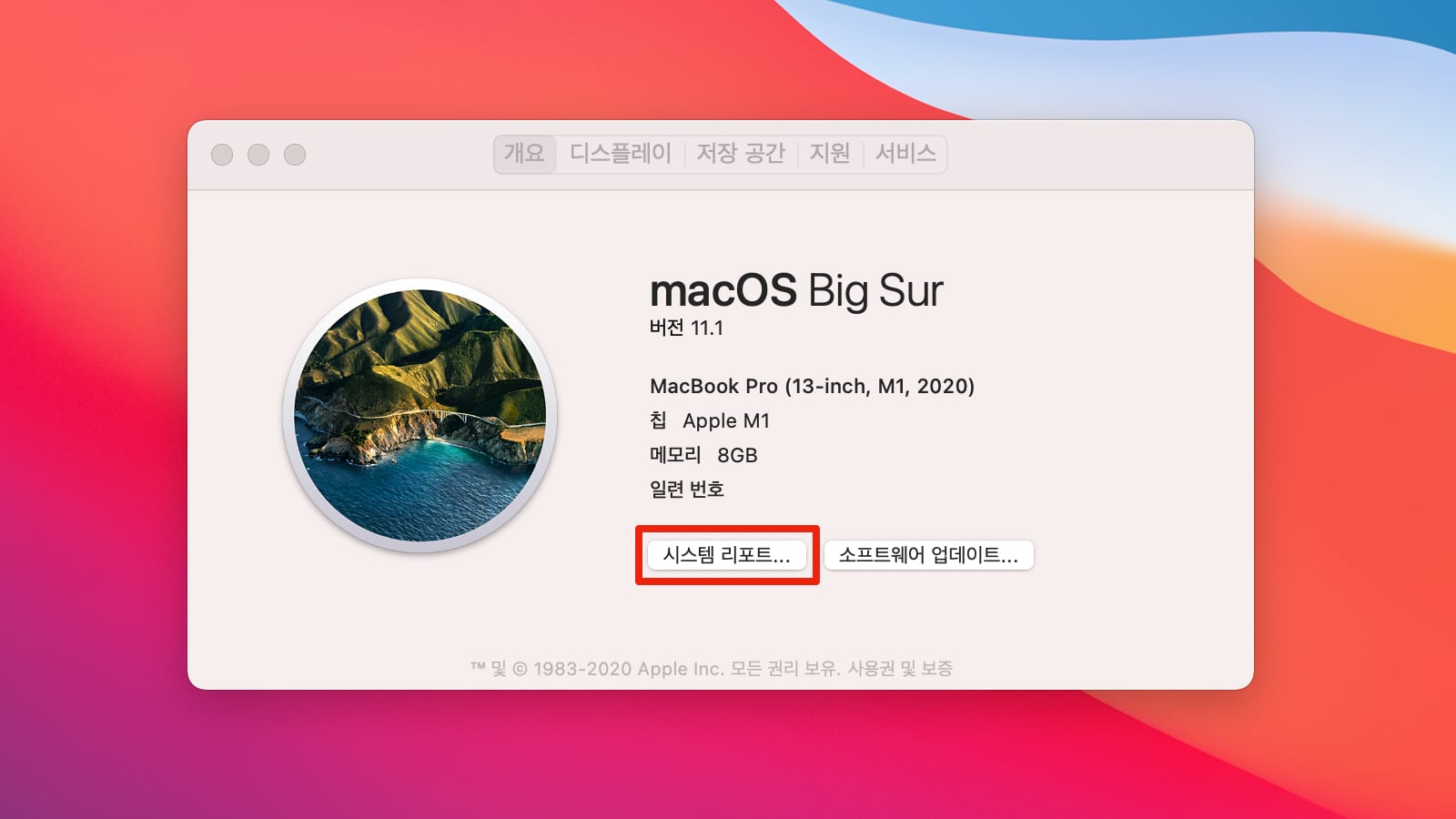 맥 정보에서 시스템 리포트로 들어가 줍니다.