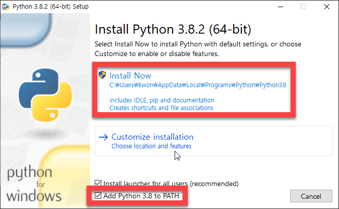 아래 "Add Python 3.8 to PATH" 를 선택해 줍니다