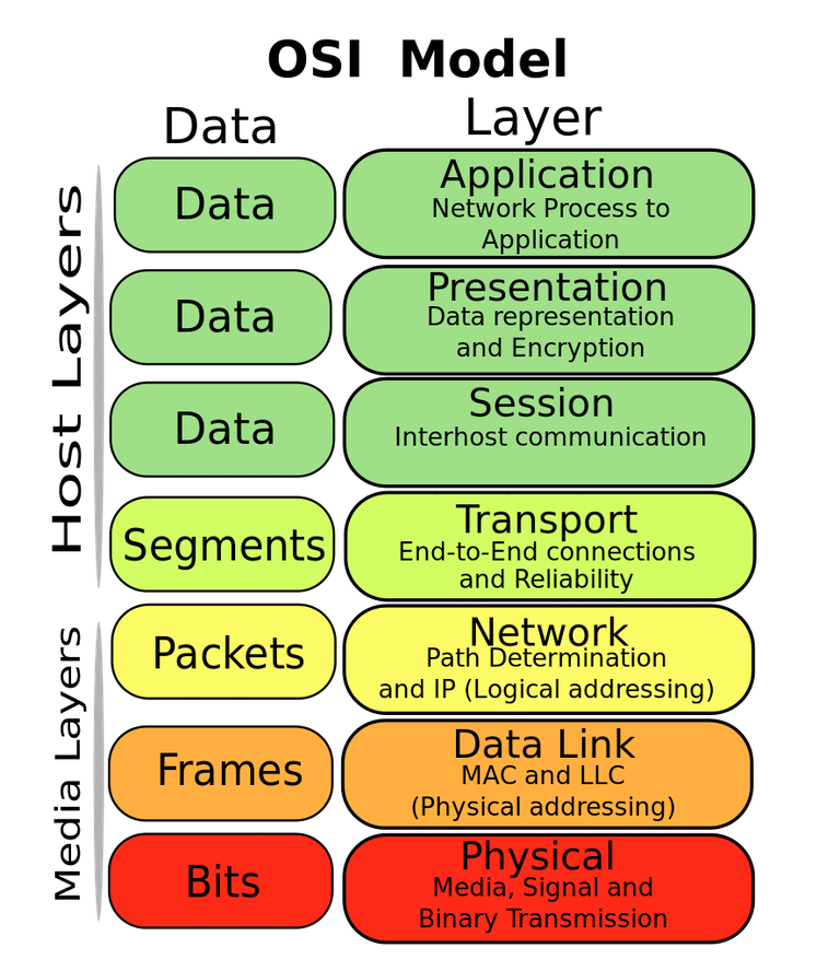 1계층 - 물리: 통신 케이블 , 리피터,허브 단위는 비트 0,1