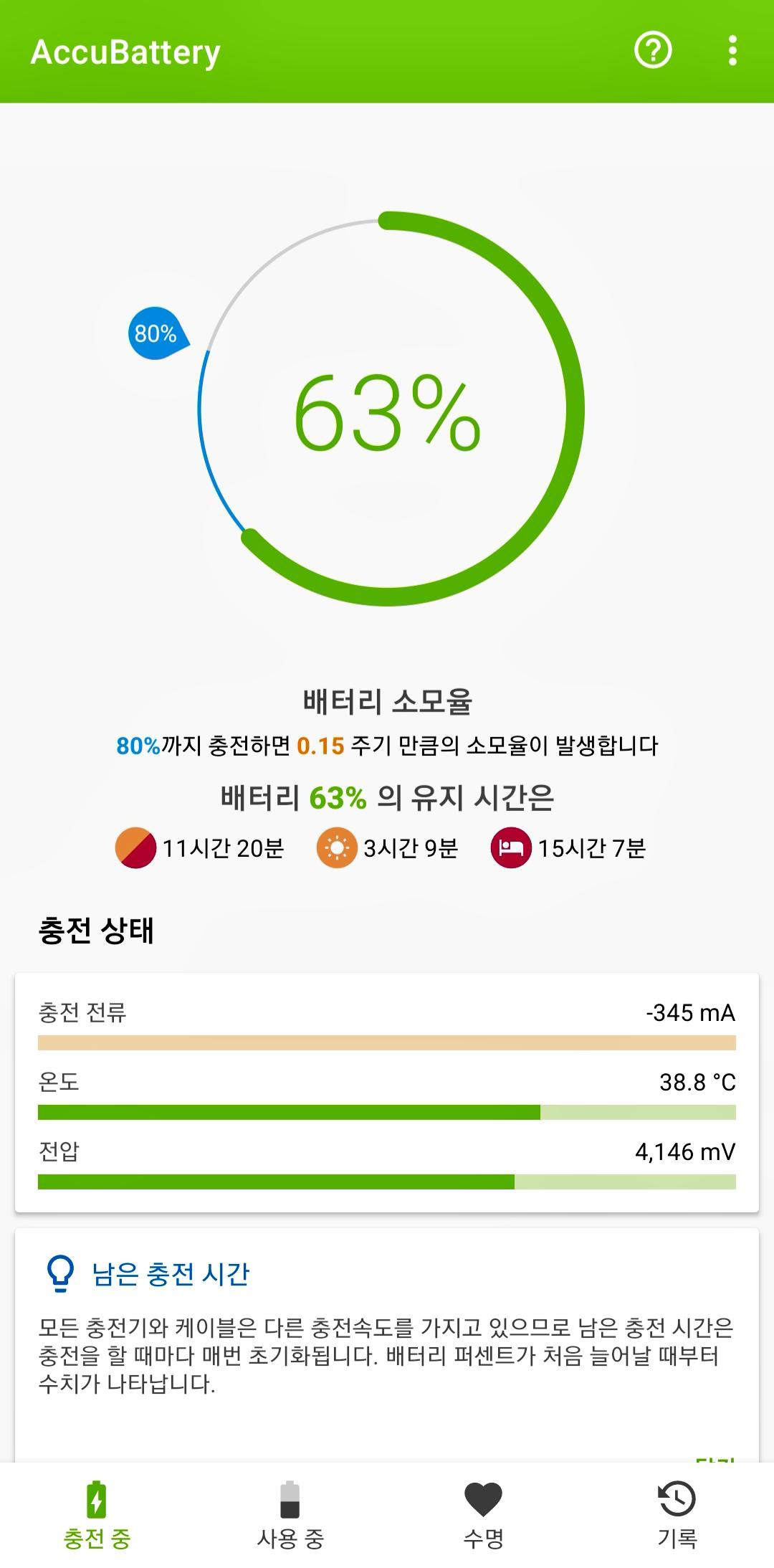 다른 앱을 통해서도 배터리 수명 체크가 가능합니다. 저 같은 경우에는 "AccuBattery" 라는 앱을 통해서 배터리를 체크해 보았습니다.
