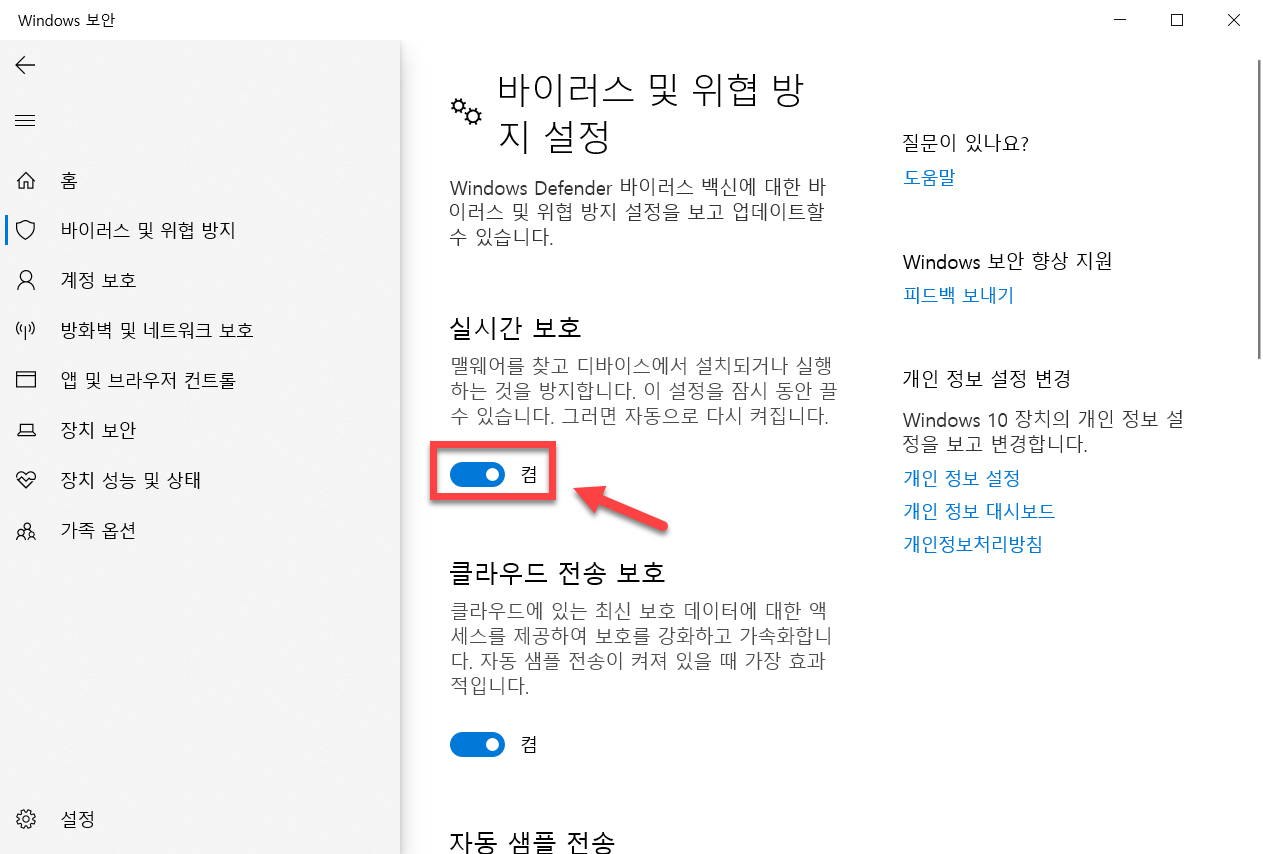 위쪽에 실시간 보호 부분에 버튼이 하나 보입니다