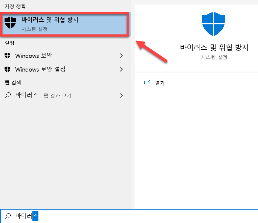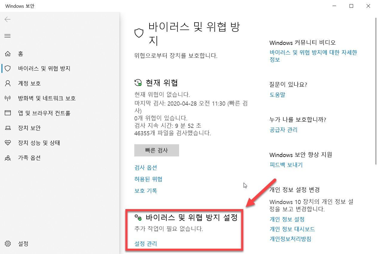 아래쪽에 보시면 "바이러스 및 위협 방지 설정"이라고 보이실 겁니다