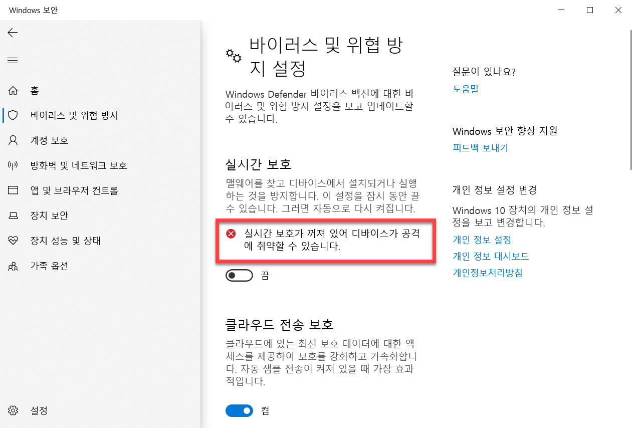 위와 같은 "실시간 보호가 꺼져 있어 디바이스가 공격에 취약할 수 있습니다"라는