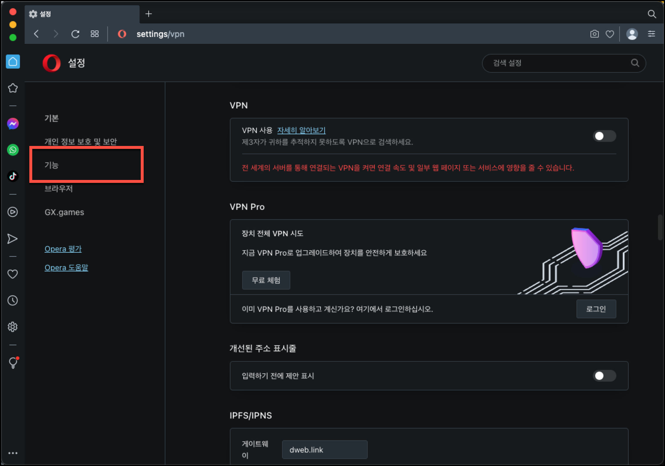 '기능' 메뉴로 이동하신 다음 VPN 메뉴를 찾아 주세요