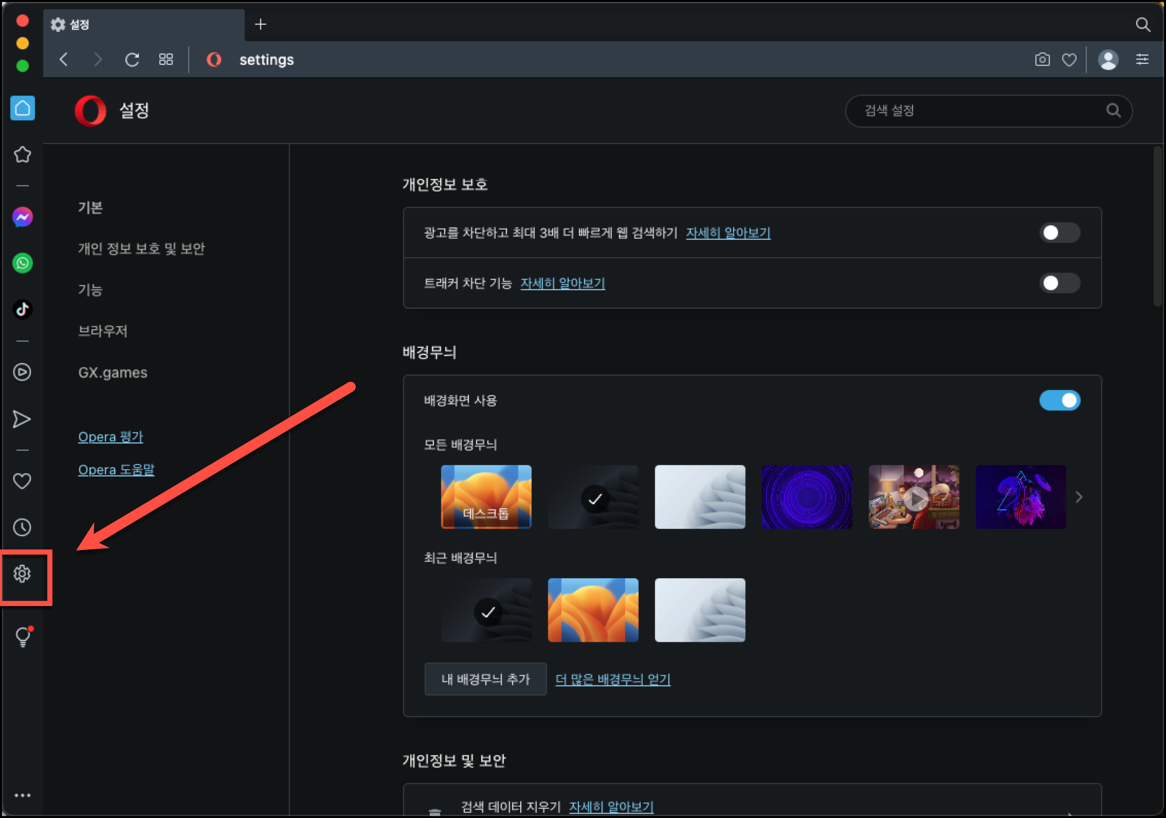 오페라 브라우저를 켜신 다음 톱니바퀴 버튼을 클릭하셔서 '설정'으로 들어가 주세요
