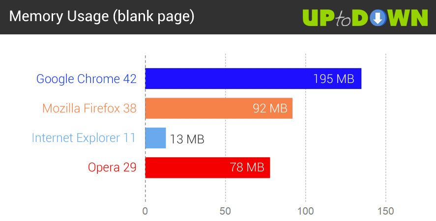 브라우저별 메모리 사용량에 대한 자료입니다. 어마무시한 메모리 사용량을 자랑하는 구글 크롬 브라우저에 비해서 절반 이하의 사용량을 보여주고 있는 오페라입니다.
