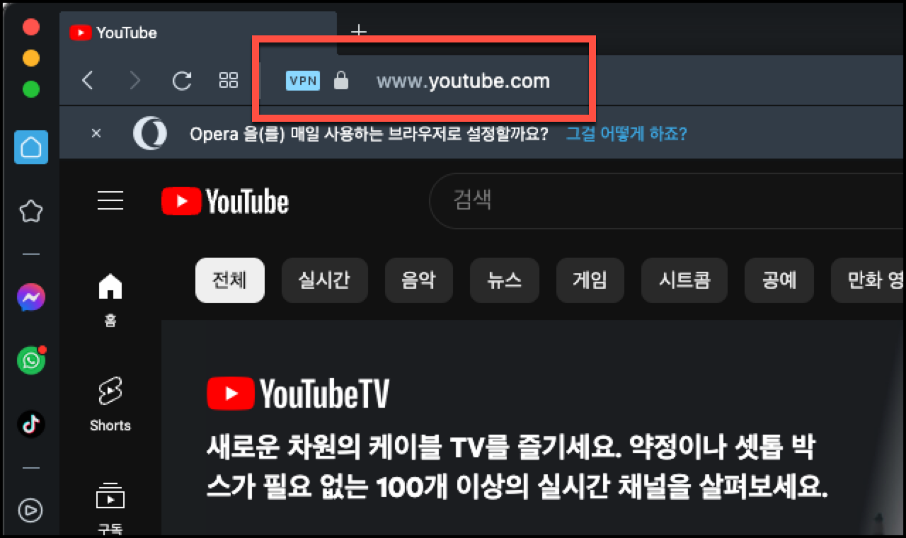 이렇게 켜진 VPN 기능은 브라우저 단에서만 동작하기 때문에 다른 서비스들에는 영향도가 없습니다.
