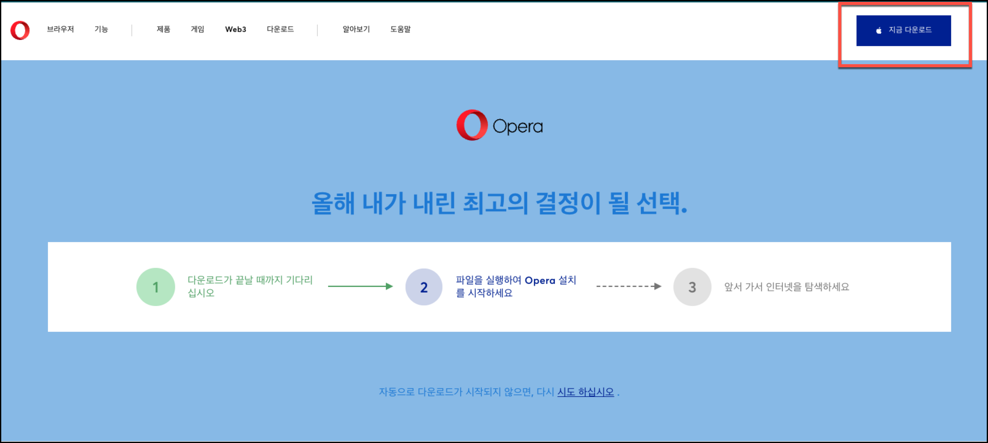 먼저 오페라 브라우저 공식 홈페이지로 이동하셔서 Opera 브라우저를 다운로드 받아주세요