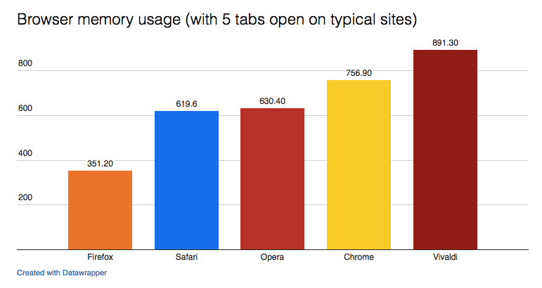 브라우저별 메모리 사용량입니다. 이 사이트에서는 5개의 탭을 오픈하고 테스트를 진행했다고 하는데 메모리 사용량은 높은수록 좋지 못한 성능이라고 보시면 됩니다.
